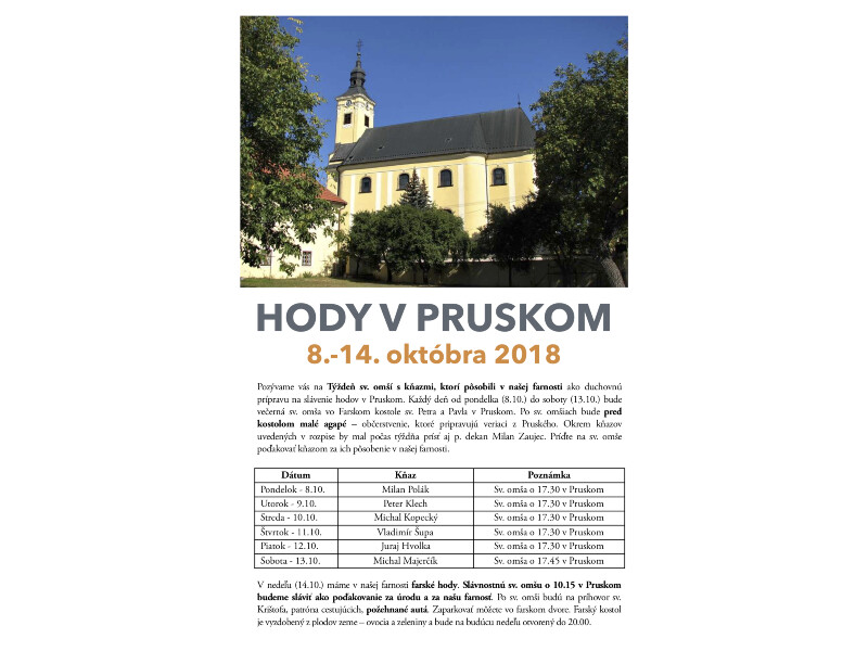 Pozývame vás na Týždeň sv. omší s kňazmi, ktorí pôsobili v našej farnosti ako duchovnú prípravu na slávenie hodov v Pruskom. Každý deň od pondelka (8.10.) do soboty (13.10.) bude večerná sv. omša vo Farskom kostole sv. Petra a Pavla v Pruskom. Po sv. omšiach bude pred kostolom malé agapé – občerstvenie, ktoré pripravujú veriaci z Pruského. Okrem kňazov uvedených v rozpise by mal počas týždňa prísť aj p. dekan Milan Zaujec. Príďte na sv. omše poďakovať kňazom za ich pôsobenie v našej farnosti.