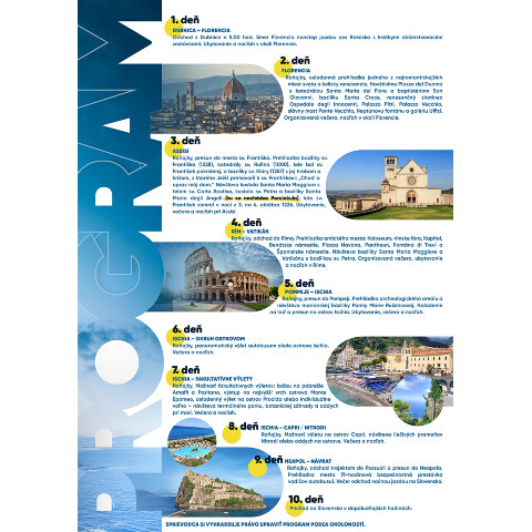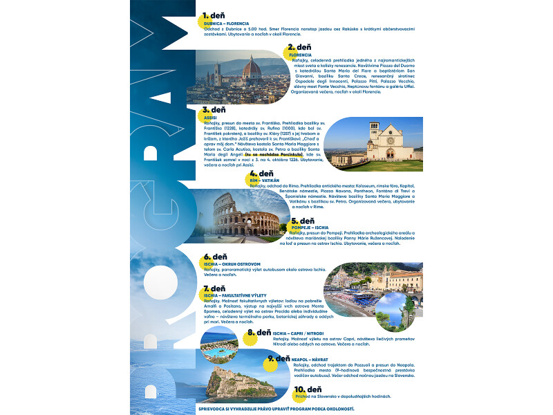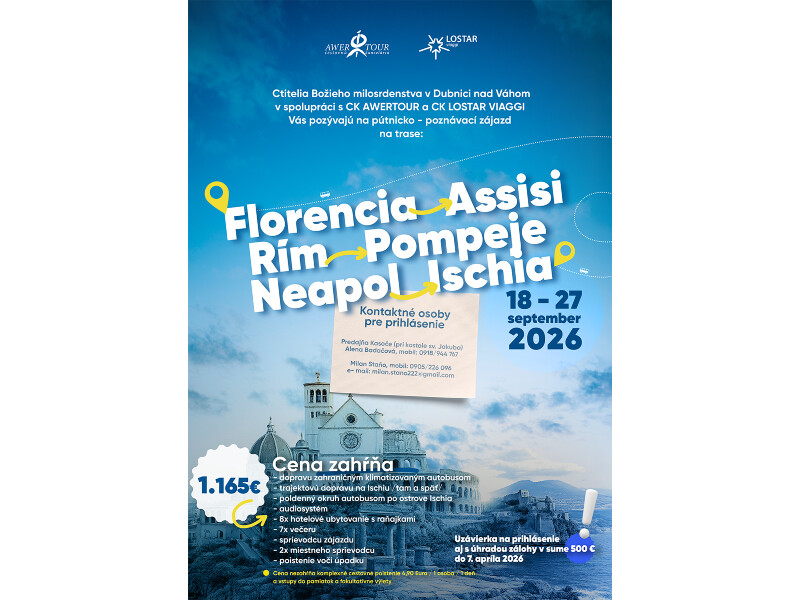Ctitelia Božieho milosrdenstva z Dubnice nad Váhom Vás pozývajú na pútnický zájazd Florencia - Asissi - Rím - Pompeje - Neapol - Ischia, ktorý sa uskutoční v termíne 18.9. - 27.9.2026.