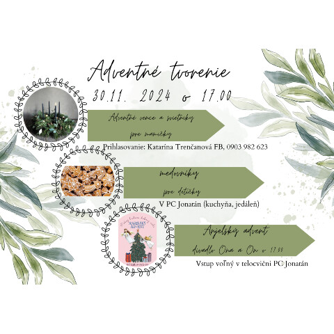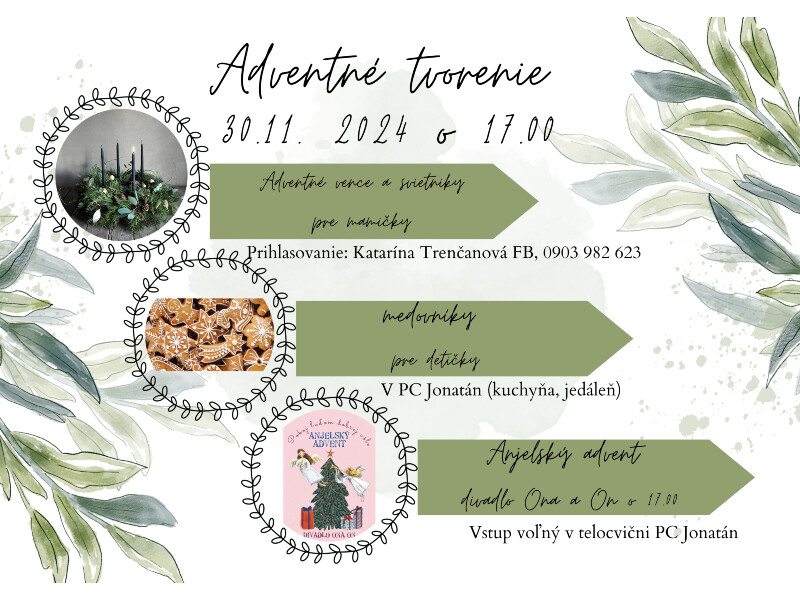 V sobotu 30.11. 2024 pozývame rodiny na adventné tvorenie do Pastoračného centra Jonatán. Mamičky sa môžu prihlásiť na tvorenie adventných vencov a svietnikov.