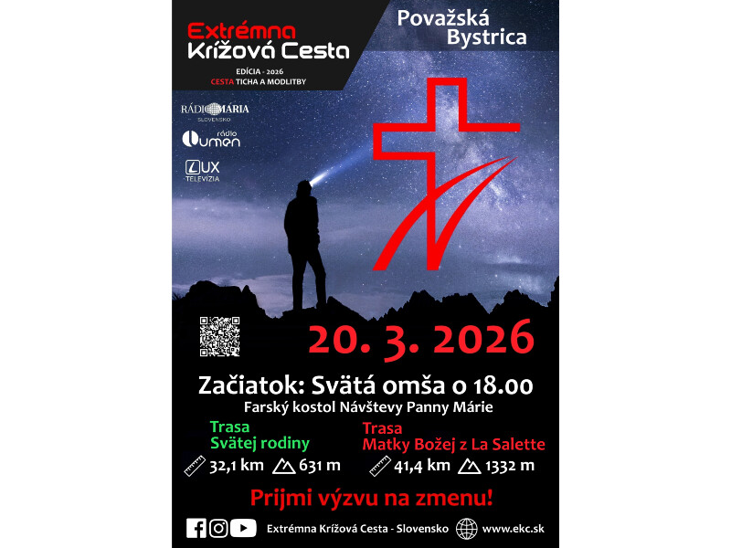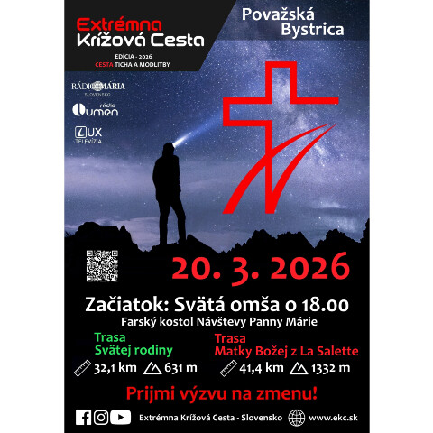 Extrémna krížová cesta, spoločenstvo Považská Bystrica pozýva záujemcov na možnosť prihlásiť sa toto podujatie, ktoré sa uskutoční 20.03.2026. Ide o extrémnu nočnú krížovú cestu počas celonočnej modlitby, ktorá sa začína večernou sv. omšou vo farskom kostole v Považskej Bystrici o 18:00 hod. Viac informácií (trasy, iné extrémne krížové cesty na Slovensku) nájdete na webe http://www.ekc.sk
