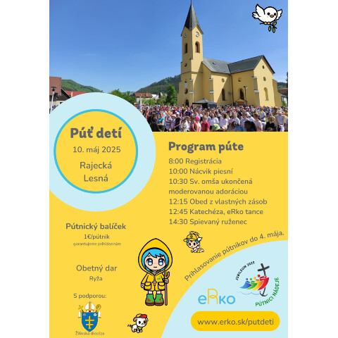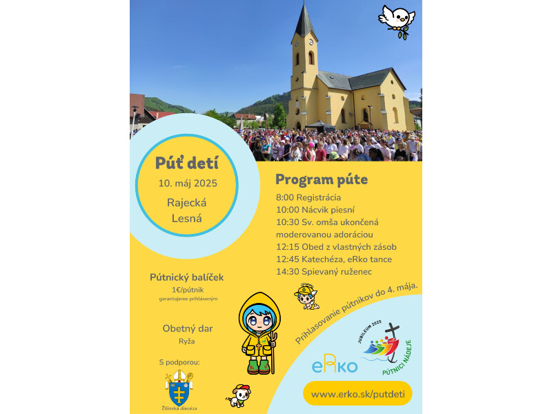 Pozývame všetky deti a aj rodiny na Jubileum detí Žilinskej diecézy - tradičnú Misijnú púť detí do Rajeckej Lesnej. Púť sa uskutoční v sobotu, 10.05.2025 so začiatkom o 10:00 hod.