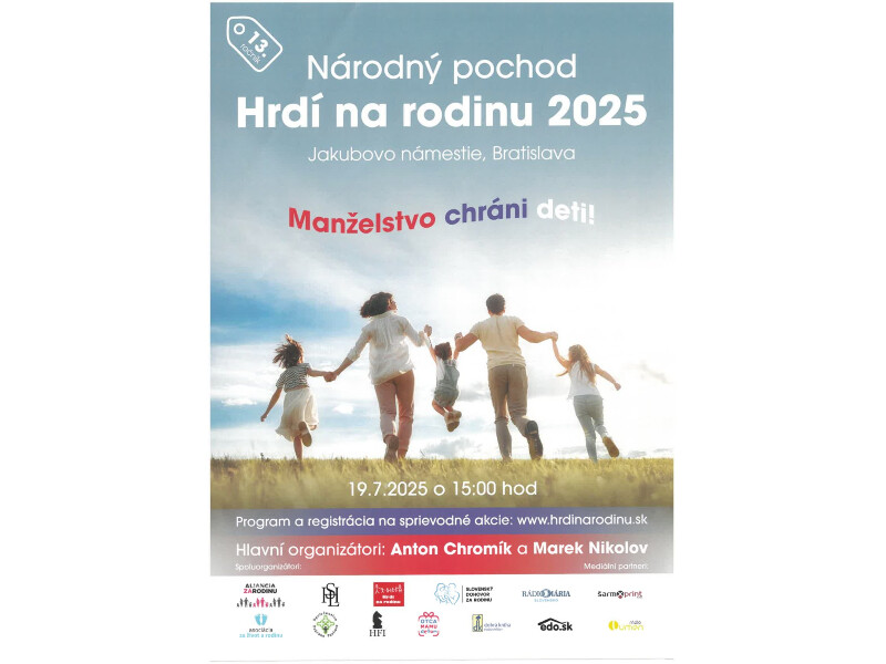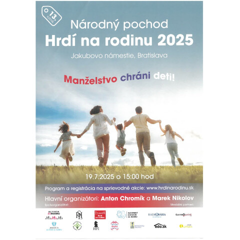 Dňa 19.07.2025 sa v Bratislave na Jakubovom námestí uskutoční národný pochod "Hrdí na rodinu". Viac informácií získate na plagáte a po kliknutí na stránku http://www.hrdinarodinu.sk