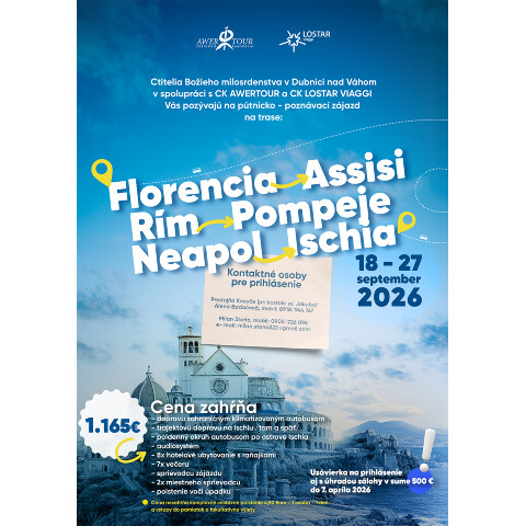 Ctitelia Božieho milosrdenstva z Dubnice nad Váhom Vás pozývajú na pútnický zájazd Florencia - Asissi - Rím - Pompeje - Neapol - Ischia, ktorý sa uskutoční v termíne 18.9. - 27.9.2026.