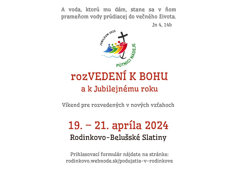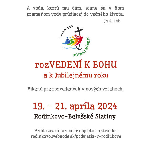 Rodinkovo, Dom prijatia pre rodiny srdečne pozýva rozvedených, žijúcich v nových vzťahoch na aktivitu - rozVEDENÍ K BOHUa k Jubilejnému roku.  Viac informácií nájdete v priloženom plagáte.