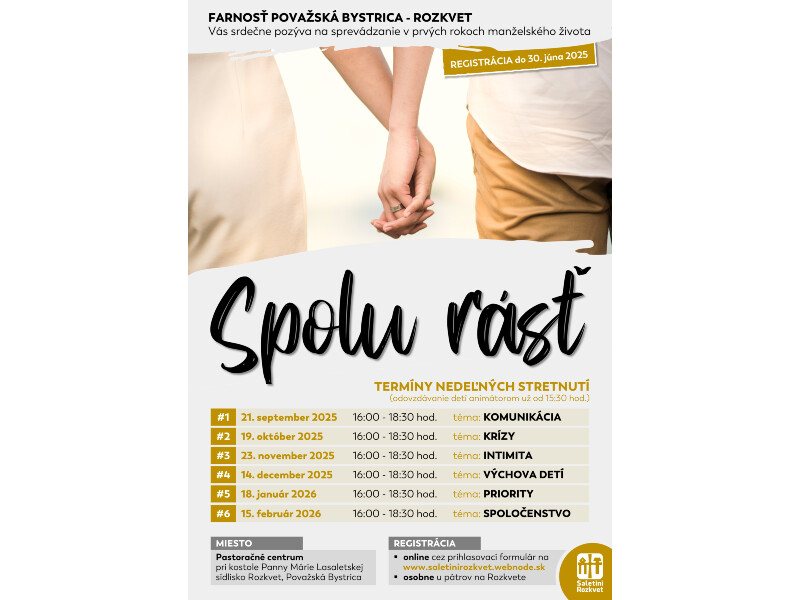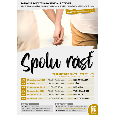 Farnosť Považská Bystrica - Rozkvet Vás pozýva na sériu nedeľných stretnutí pod názvom SPOLU RÁSŤ, ktoré sú zamerané na sprevádzanei počas prvých rokov manželstva.